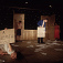 On a crude wooden stage, a group of five performers use a semi-translucent curtain, whisked backwards and forwards to reveal the fragmentary traces of a single apocalyptic night. Read narratively, the piece shows a night of crisis which is perhaps both personal and global. The invoked ‘scenes’ include a chaotic, almost nonsensical TV newsroom, a domestic space in which the walls themselves are always in motion, and a panoramic glimpse of many characters presented via cardboard signs that bear names, such as THE HYPNOTISED GIRL or ELVIS PRESLEY.