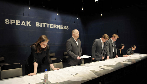 The essence of Speak Bitterness is a line of people making confessions from behind a long table. Occupying a brightly lit space, the performers take turns reading from the text that is strewn across the table. The litany of wrongdoing to which they confess ranges from the big time of forgery, murder or genocide to nasty little details, such as reading each other’s diaries and refusing to take the dogs out for a walk.